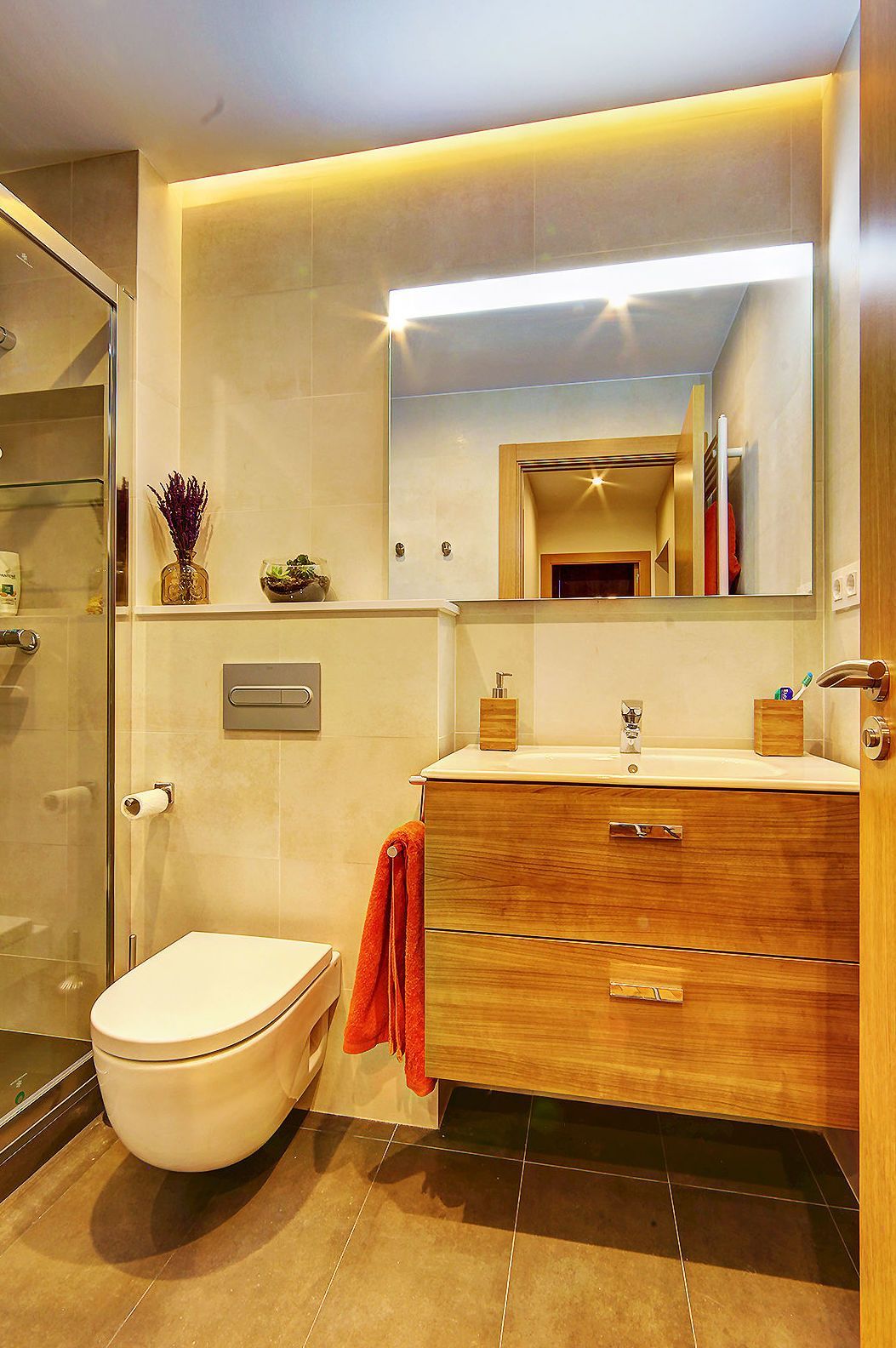 La cocina, abierta pero "protegida" de las miradas ajenas, se integra perfectamente. En la zona de noche, un dormitorio principal de medidas ajustadas pero muy funcional en su distribución y el estudio/dormitorio de invitados, terminan de configurar una vivienda especialmente cómoda.